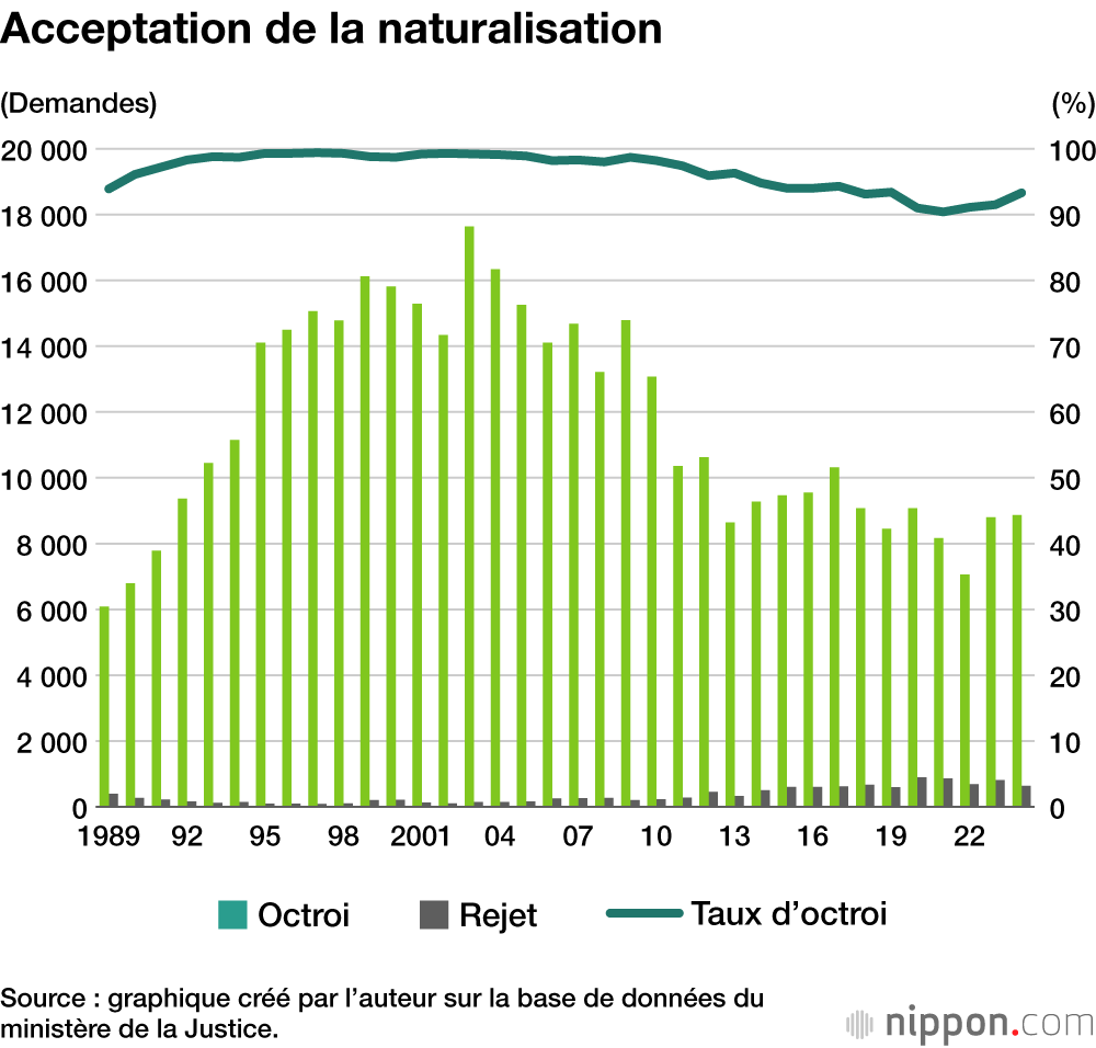 Les premières données sur les naturalisations remontent à 1989. Selon ces chiffres, le nombre annuel de ressortissants nés à l’étranger qui obtiennent la nationalité japonaise est en baisse tendancielle depuis 2003 (année du pic d’octroi avec 18 000 naturalisations). Depuis 2010, il plafonne à 10 000 naturalisations. Le taux de réussite reste élevé. S’il dépasse régulièrement les 90 %, il a baissé ces dernières années et depuis 2013 il reste sous la barre des 95 %.