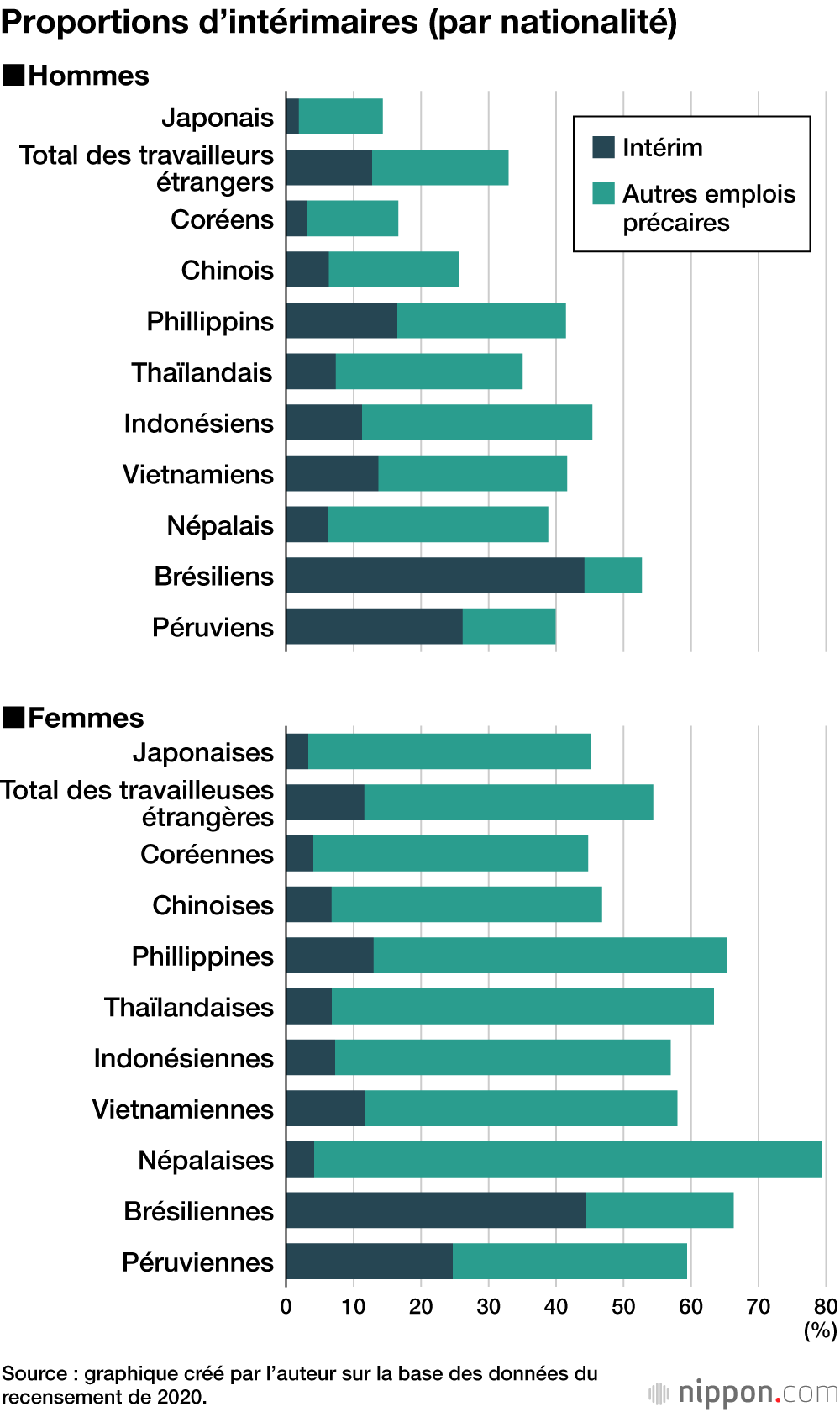Les données du dernier recensement (2020) montrent que les ressortissants étrangers travaillent beaucoup plus dans l’intérim que les citoyens japonais. La différence est particulièrement marquée chez les hommes : 14 % des hommes japonais sont intérimaires, contre 53 % des Brésiliens, 45 % des Indonésiens et 40 % environ des Vietnamiens, Népalais et Péruviens. L’écart est moins frappant chez les femmes, mais le taux d’intérimaires reste particulièrement élevé chez les ressortissantes d’Asie du Sud-Est, d’Amérique du Sud et du Népal (cf. les graphes ci-dessous).