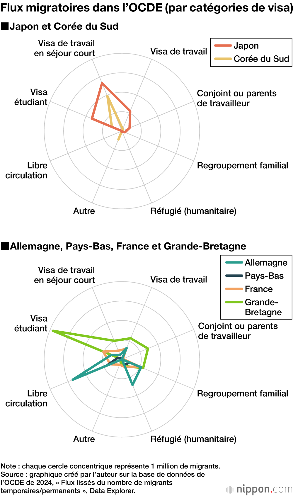 Les statistiques publiées par l’OCDE permettent de comparer et voir comment le Japon diffère d’autres pays sur la question des visas. Si on met de côté le cas particulier du tourisme, le gouvernement japonais délivre essentiellement des visas étudiants et des visas de travail à court ou long terme. Très peu d’étrangers obtiennent un visa de séjour long s’ils ne viennent pas en qualité d’étudiants ou de travailleurs.