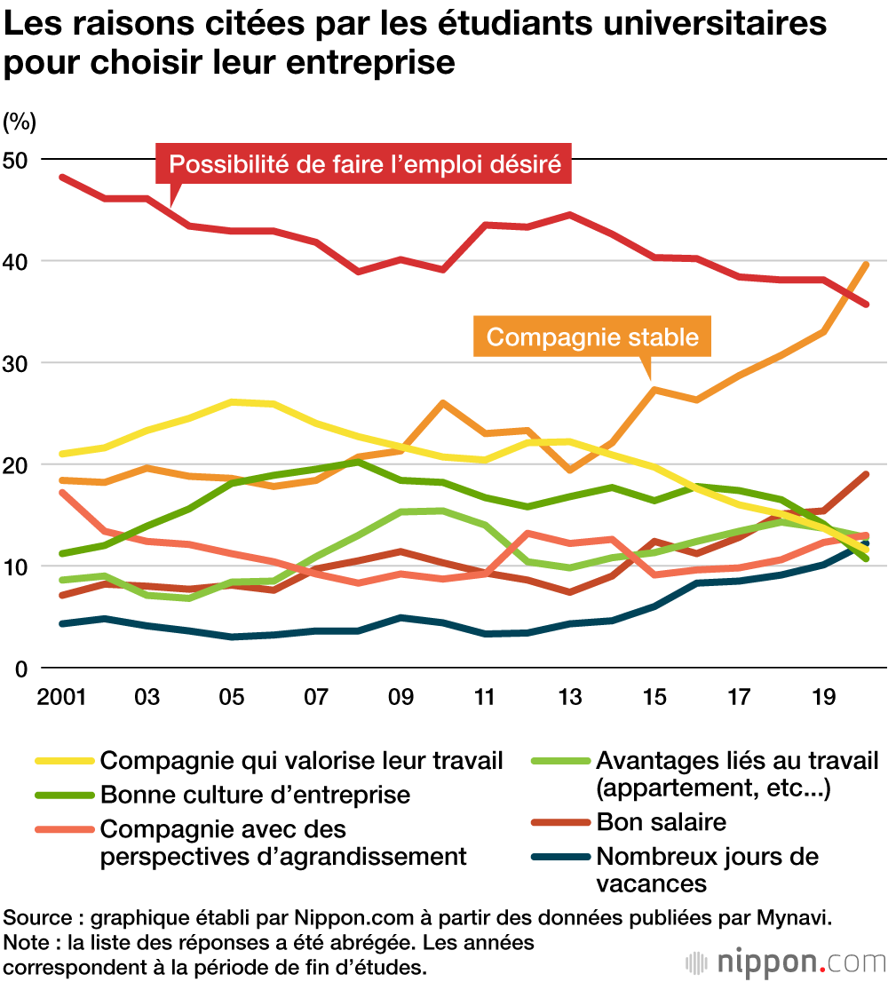 Les attitudes changent parmi les étudiants universitaires en ce qui concerne le choix de leur futur travail. Une enquête d'avril 2019 publié par le service d’informations et de recherches d’emploi Mynavi a révélé que le critère privilégié pour choisir un employeur potentiel, cité par 39,6 % des étudiants interrogés, était la « stabilité » de l'entreprise. Il s'agit d'une augmentation de 6,6 points par rapport aux résultats des sondages précédents, pour lesquels le critère « pouvoir faire le travail souhaité » était le plus souvent cité, et ce chaque année depuis l’enquête auprès des diplômés de 2001.