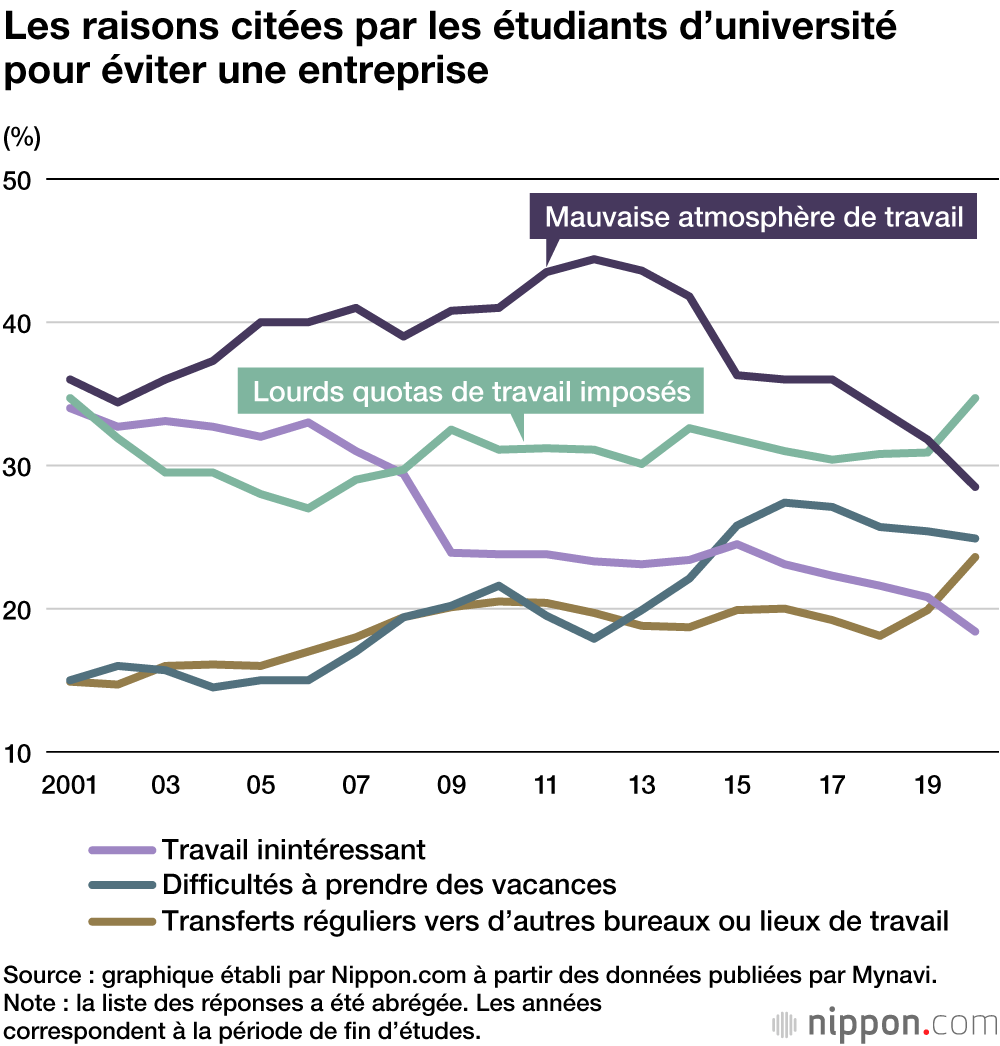 Les étudiants sont également interrogés sur le type d'entreprises qu'ils ont tendance à éviter. Dans le sondage de cette année, le type d’entreprise le moins populaire est celui qui attribue des quotas rigoureux aux employés. Ce facteur négatif a été cité par 34,7 % des répondants, ce qui représente une augmentation de 3,8 points sur un an, dépassant ainsi « l’atmosphère de travail désagréable » (28,5 %, soit une diminution de 3,3 points sur un an), qui avait été la principale raison invoquée par les futurs diplômés depuis l’ouverture de l’enquête en 2001.
