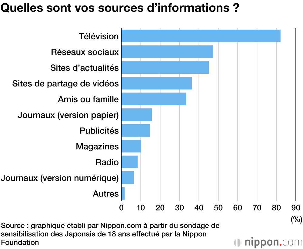 Selon un sondage de sensibilisation aux médias effectué par la Nippon Foundation, les Japonais de 18 ans s’informent principalement en regardant la télévision. Le petit écran est plébiscité par 82,1 % des répondants, largement devant les réseaux sociaux, qui représentent 47,1 %, les sites internet d’actualités, qui comptent pour 45,1 % et les sites internet de diffusion et de partage de vidéos, avec 36,4 %.
