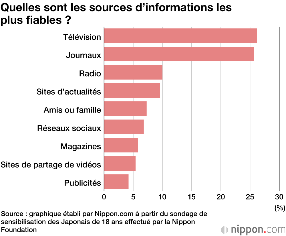 Les Japonais de 18 ans ont également été invités à s’exprimer au sujet des médias auxquels ils font le plus confiance. Là encore, la télévision et les journaux, considérés comme extrêmement fiables, arrivent en tête dans les réponses les plus fréquemment données avec respectivement 26,2 % et 25,7 %. Les réseaux sociaux, les sites internet d’actualités et les sites internet de partage de vidéos, eux, ne semblent guère avoir la cote auprès des jeunes. Entre 5 à 10 % des répondants seulement disent s’en servir comme source d’informations « très fiables ».