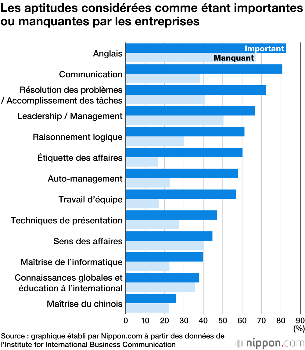 Dans une récente enquête effectuée par l’Institute for International Business Communication, l’organisme qui met en place le test d’anglais TOEIC, les entreprises japonaises ont été interrogées sur les compétences qu’elles jugent importantes pour les hommes d’affaires à l’avenir. La réponse la plus fréquemment obtenue, avec 82,6 %, est l’aptitude à communiquer en anglais. Parallèlement, cette compétence est également perçue comme la plus déficiente, selon 67 % des entreprises.