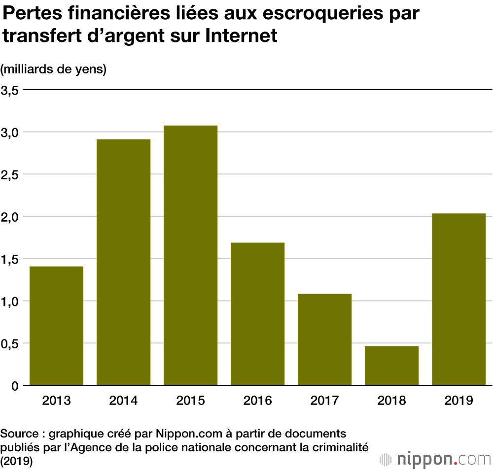Les pertes financières liées aux escroqueries par transfert d’argent sur Internet ont été multipliées par 4,4, atteignant la somme colossale de 2 032 milliards de yens. Le nombre d’escroqueries et les sommes encourues avaient pourtant diminué en 2016 grâce à l’amélioration des mesures de sécurité des institutions financières. Mais malheureusement, seulement pour un temps puisque cette tendance s’est soudainement inversée, repartant de plus belle à la hausse en septembre 2019.