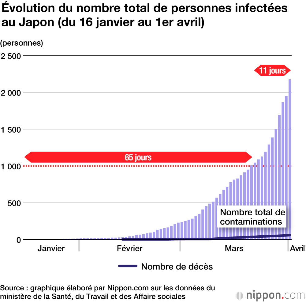 Concernant le Japon, le tout premier cas officiel de coronavirus avait été recensé le 16 janvier. Depuis, il a fallu 65 jours pour que le nombre de cas atteigne les 1 000. Alors que l’évolution de la propagation semblait avoir été lente et contenue, le chiffre a bondi à partir du 22 mars environ, et en 15 jours à peine, il avait dépassé la barre des 4 000. Le dernier chiffre en date, au 7 avril à 12 h (heure locale), le nombre de personnes infectées s’élevait à 4 111.