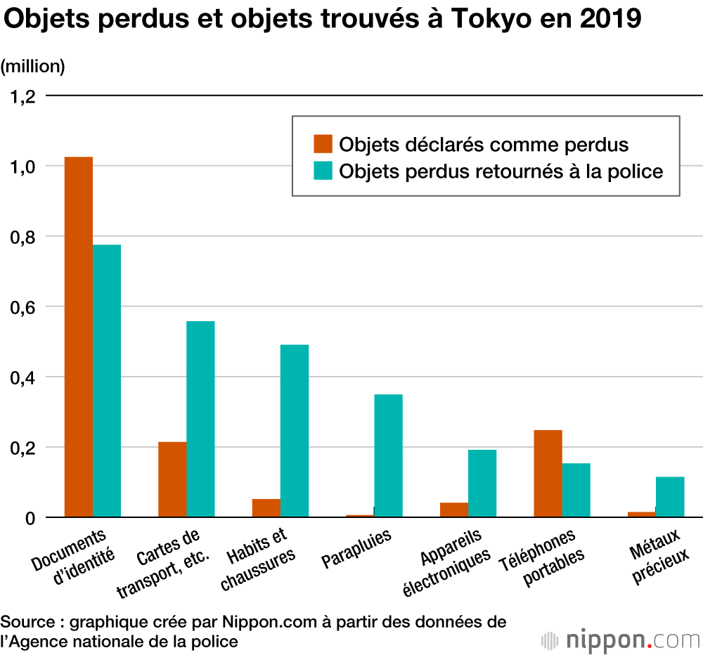 Selon l’Agence nationale de police, si les articles n’ont pas été réclamés après trois mois par leur propriétaire d’origine, ils peuvent être transférés à la personne qui l’a trouvé. Cependant, au bout de deux mois supplémentaires, si personne n’est venue réclamer l’article, la propriété passe à la préfecture. Une étude des objets trouvés montre que sur les 3,9 milliards de yens en espèces remis aux postes de police de Tokyo, 2,8 milliards de yens ont été restitués à leurs propriétaires, 540 millions de yens sont allés aux trouveurs, et 492 millions de yens sont revenus à la préfecture.