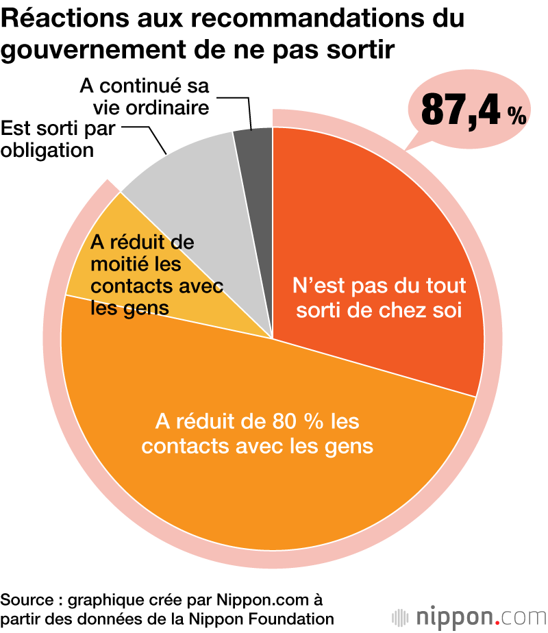 Entre le 21 et le 23 avril, la Nippon Foundation a effectué un sondage sur plus de 1 000 adolescents âgés de 17 à 19 ans. Les résultats révèlent que 87,4 % d’entre eux ont suivi les recommandations du gouvernement et des autorités locales visant à éviter de sortir de chez soi. Ce pourcentage inclut également les personnes n’étant pas du tout sorties de chez elles.