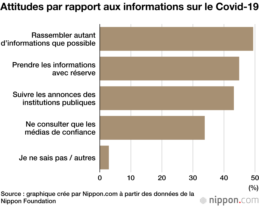 Parmi les jeunes interrogés, 81,3 % tentent activement de recueillir des informations sur les maladies infectieuses, et la moitié d’entre eux (49,4 %) essaient de rassembler autant d'informations que possible. Environ 40 % des sondés déclarent ne pas prendre toutes les informations au pied de la lettre, mais dépendre plutôt des annonces des institutions publiques. Le sondage indique ainsi que les adolescents japonais prennent soin de ne pas se laisser influencer par les fausses nouvelles. (Voir notre article lié : La fiabilité et la diffusion des informations de santé mises à l’épreuve par le coronavirus au Japon)