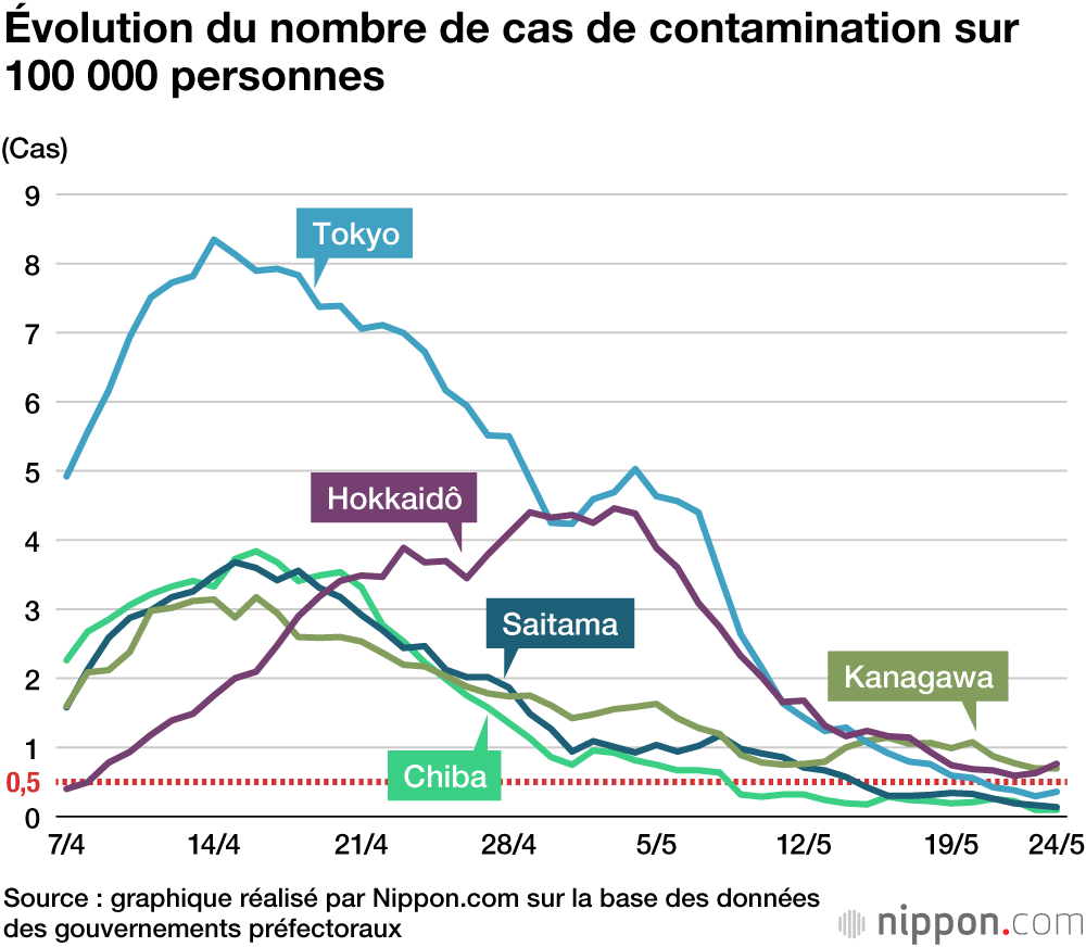 La courbe du nombre de cas s’est donc affaissée petit à petit, particulièrement à partir du mois de mai, et le ratio est passé sous la barre des 0,5 cas pour 3 des 5 préfectures restantes. Celles de Kanagawa et Hokkaidô sont restées un peu plus au-dessus, mais la tendance à la baisse a permis de décider la levée totale de l’état d’urgence.