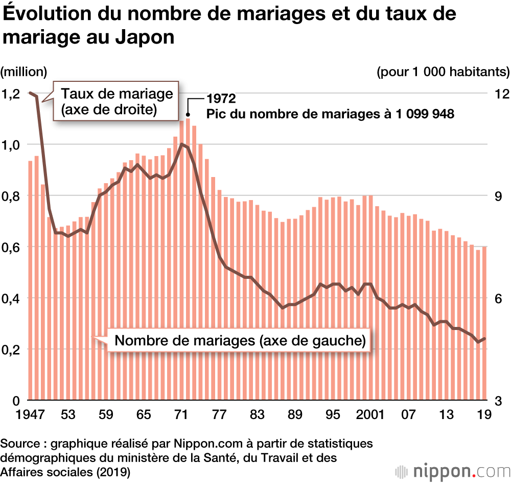 Selon des statistiques publiées par le ministère de la Santé, du Travail et des Affaires sociales, en 2019, environ 598 000 couples se sont passé la bague au doigt, soit environ 12 000 de plus que l’année précédente. Après avoir atteint un pic de 1,1 million en 1972, le nombre de mariages a progressivement décliné. Ce chiffre a connu une augmentation passagère dans les années 90 pour à nouveau diminuer après 2000.