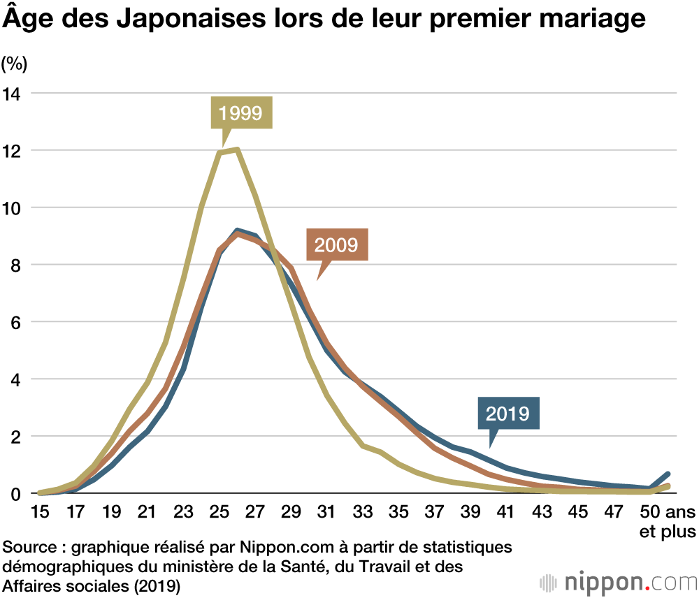 Si l’âge où des femmes se mariant pour la première fois est de 25 ans, comme c’est le cas depuis 20 ans, la proportion de femmes âgées entre 20 et 25 ans, elle, a diminué, révélant une tendance à se marier de plus en plus tard.