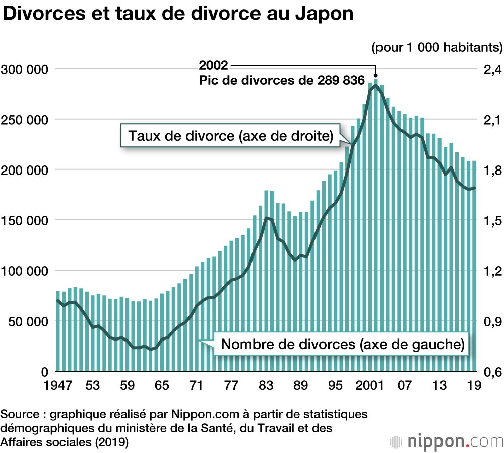 En 2019, 208 489 couples ont divorcé, soit 156 de plus que l’année précédente. Le taux de divorce pour 1 000 habitants a augmenté de 0,01 point de pourcentage, pour atteindre 1,69. Si le nombre de divorces était en constante augmentation depuis les années 1990, après avoir atteint un pic de 290 000 en 2002, il a au contraire diminué.