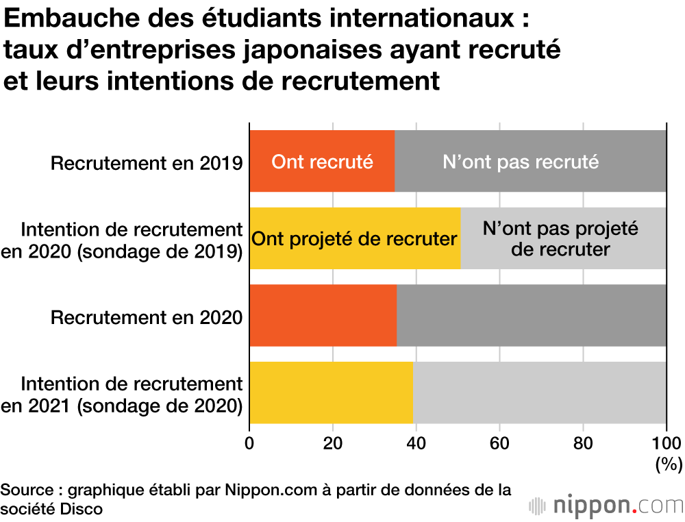 En décembre 2020, la société de recrutement et de développement de carrière Disco a réalisé un sondage auprès des grandes entreprises japonaises sur l’embauche de travailleurs étrangers hautement qualifiés. Sur les 494 entreprises qui ont répondu, 35,4 % ont embauché des étudiants étrangers en 2020, soit une légère augmentation par rapport à 2019.