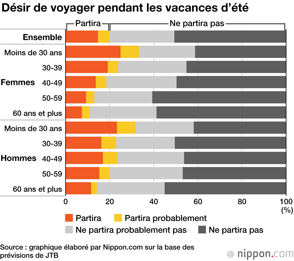 Interrogés pour savoir s’ils partiraient en vacances pendant la période indiquée, 19,8 % des répondants au total ont déclaré qu’ils « partiraient » ou qu’ils « pourraient partir ». Les plus jeunes générations souhaitaient vivement voyager, avec 33,2 % de femmes et 31,6 % d’hommes âgés de 29 ans ou moins désirant partir. Ceci a été en contraste avec les 10,8 % de femmes et 14,2 % d’hommes âgés de 60 ans et plus.