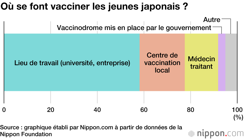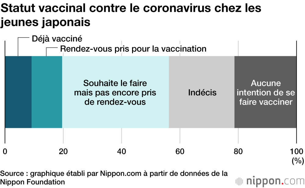 La Nippon Foundation a mené une étude auprès de 1 000 jeunes au sujet de leur statut vaccinal actuel (entre le 16 et le 20 juillet). 19,6 % des répondants ont déclaré être soit vaccinés, soit avoir pris un rendez-vous pour le faire. 36,6 % ont confié souhaiter se faire vacciner, mais n’avaient pas encore pu obtenir de rendez-vous. D’autre part, 21,3 % n’avaient aucune intention de se faire vacciner et 22,5 % étaient encore indécis.