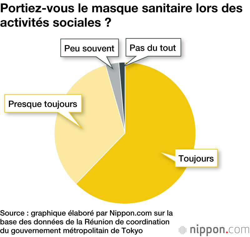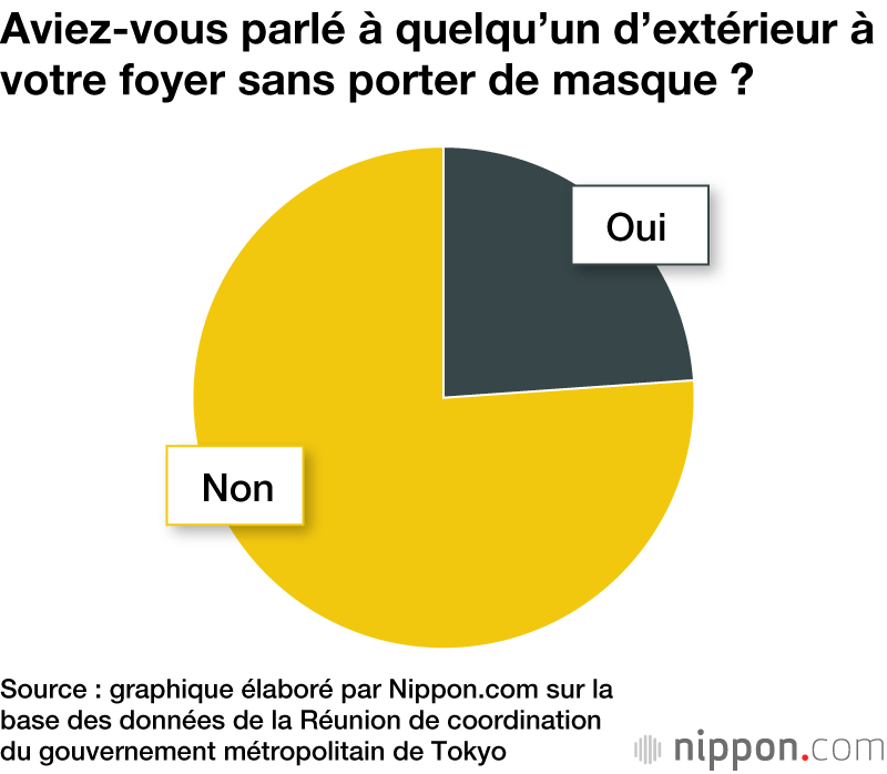 Selon une étude conduite par la Réunion de coordination du gouvernement métropolitain de Tokyo auprès de personnes ayant été contaminées par le Covid-19, près d’un tiers des répondants (32,7 %) avaient participé à une activité sociale comprenant de l’alcool, avaient mangé et bu dans un grand groupe ou avec d’autres personnes pendant une longue période, ou avaient parlé avec quelqu’un n’appartenant pas à leur foyer sans porter de masque durant les deux semaines précédant directement le début des symptômes (ou la date du test PCR pour les patients asymptomatiques).