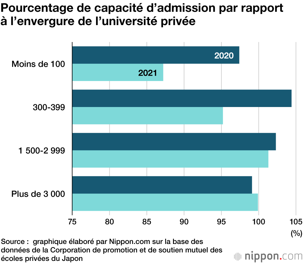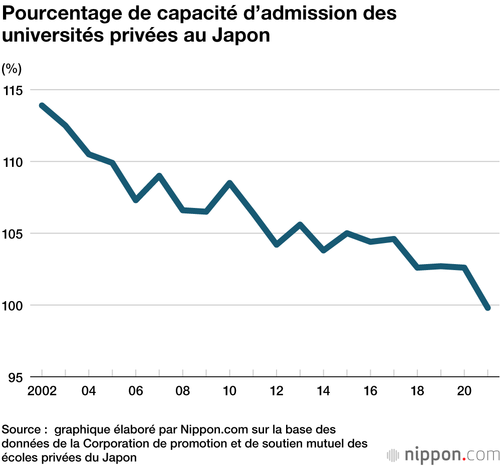 Une enquête évaluant les changements dans les demandes d’admission dans les universités privées, menée par la Corporation de promotion et de soutien mutuel des écoles privées du Japon, a montré que le pourcentage total de capacité d’admission (rapport entre le nombre d’inscrits et la capacité d’admission) au printemps 2021 avait chuté à 99,8 %.