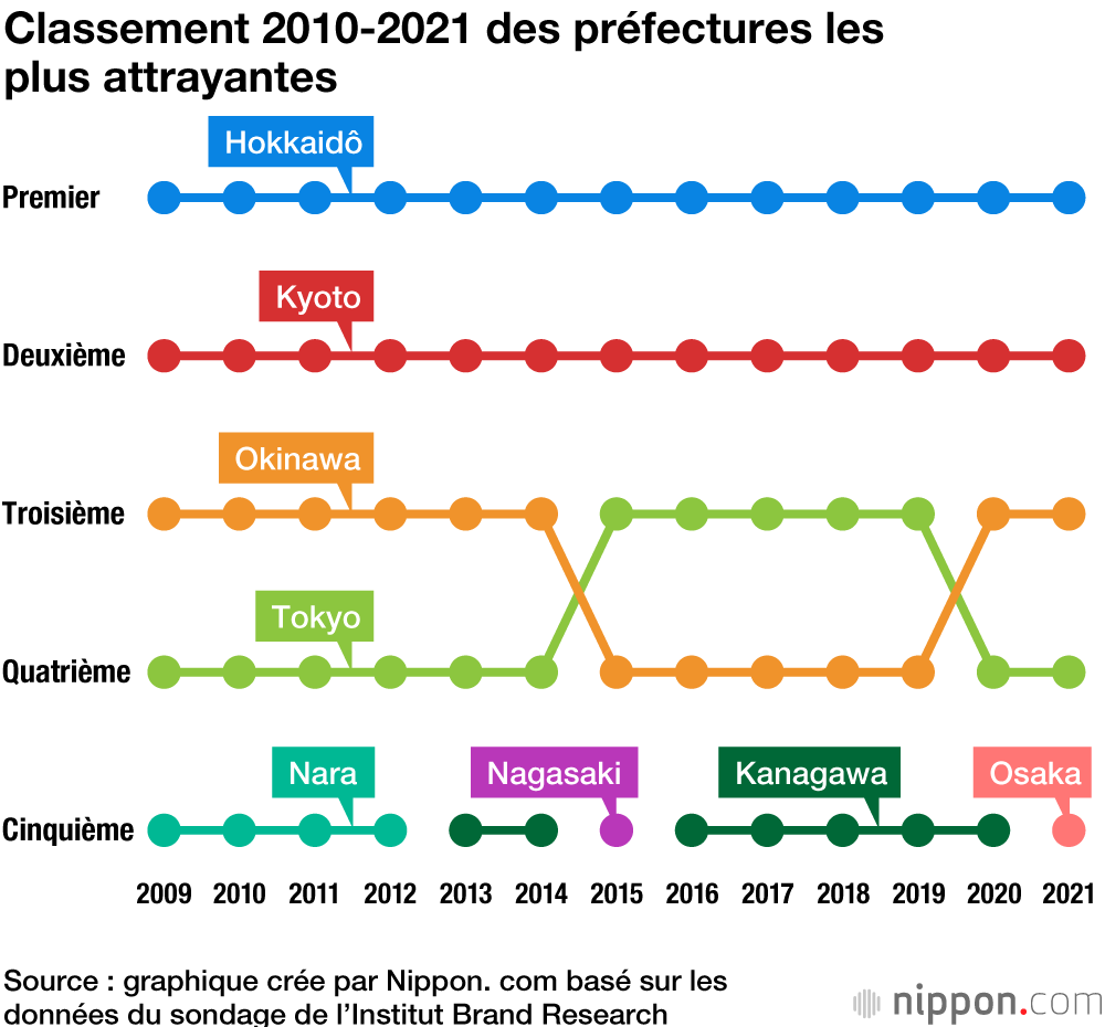 Kyoto maintient sa deuxième place depuis 2009. Peu de changements sont survenus en tête de liste en 2021, bien qu’Osaka a doublé Kanagawa pour terminer en 5e position. Nagasaki rejoint les dix premiers.