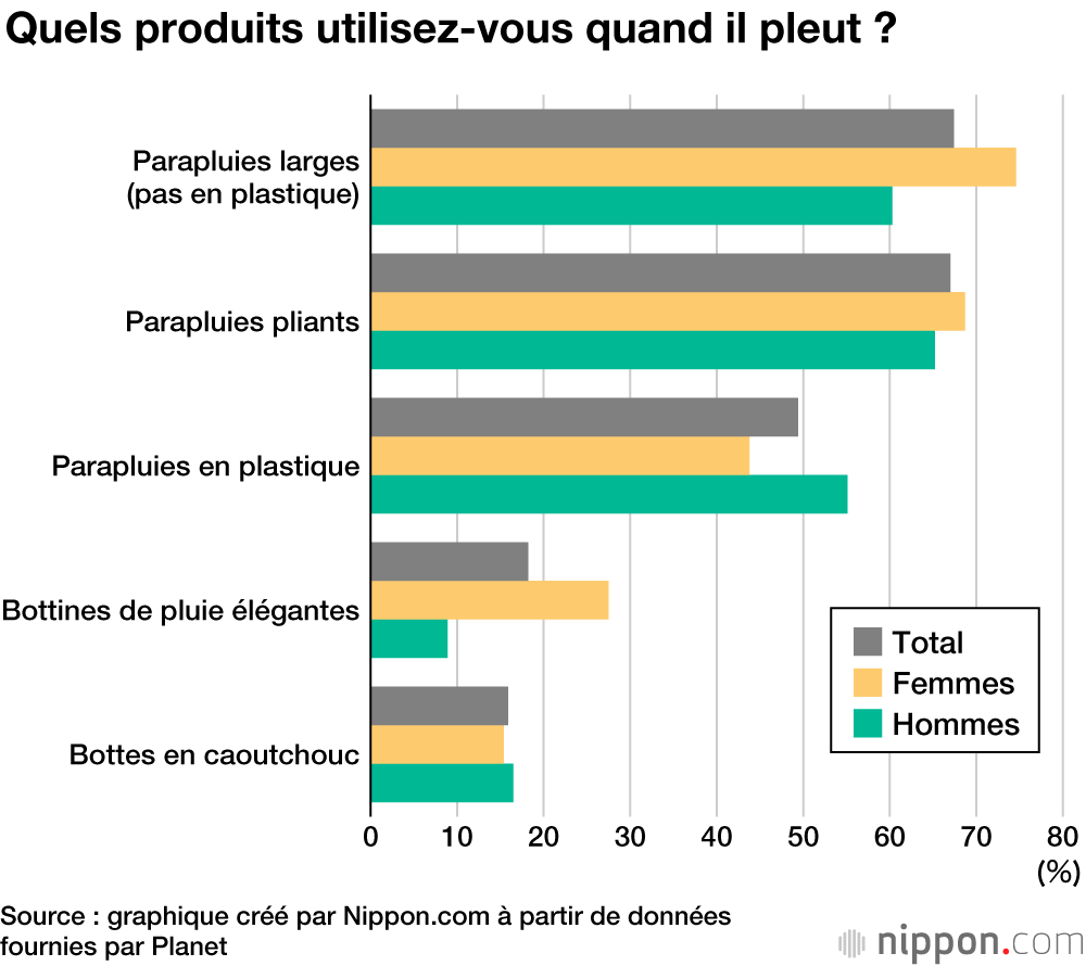 La société de recherche Planet a demandé à 4 000 personnes quels produits ils utilisent par temps pluvieux (plusieurs réponses possibles), et les réponses les plus populaires étaient « parapluie large non plastique » (67,4 %) et « parapluie pliant » (67,0 %). Mais presque la moitié des gens (49,4 %) se servent de « parapluies en plastique ».