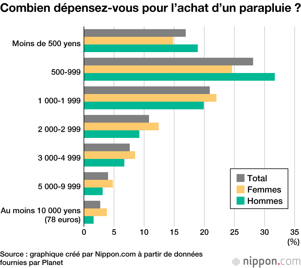 Les hommes en particulier préfèrent les parapluies bon marché, à moins de 500 ou de 1 000 yens, tandis que les femmes préfèrent les parapluies un peu plus onéreux.