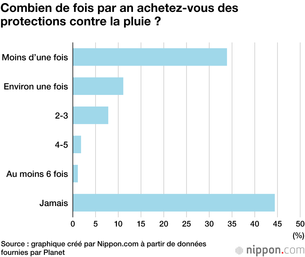 Au niveau des prix, 28,1 % des répondants utilisent des parapluies vendus entre 500 yens and 999 yens (entre 3,9 et 7,8 euros), suivi de 20,9 % entre 1 000 yens et 1 999 yens (entre 7,8 et 15,6 euros) et 16,9 % à moins de 500 yens. Même les personnes qui n’utilisent pas de parapluies en plastique aiment bien les modèles peu chers, avec 60 % des consommateurs amateurs de prix à moins de 2 000 yens.