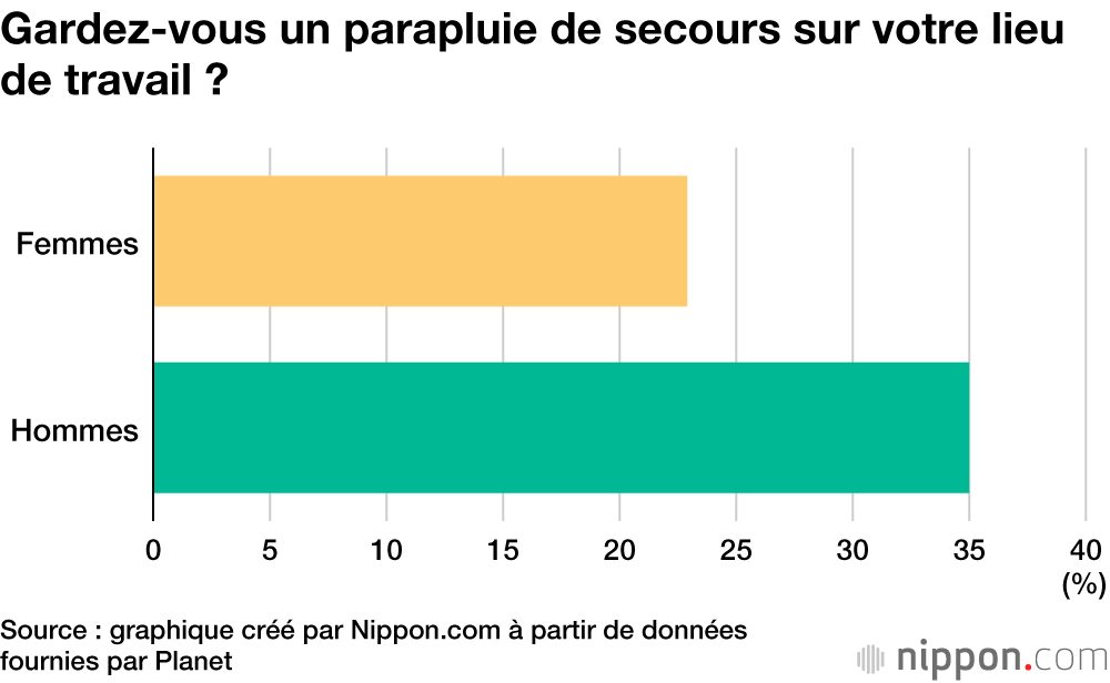 La fréquence à laquelle les gens se retrouvaient dans l’obligation d’acheter une protection contre la pluie était de « jamais » pour 44,4 %, et 45 % au total qui le font « moins qu’une fois par an » ou « environ une fois l’an ». Par ailleurs, beaucoup plus d’hommes que de femmes ont répondu qu’ils gardaient un parapluie de secours sur leur lieu de travail.