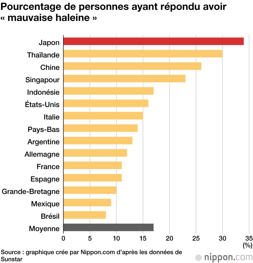 Par ailleurs, la « mauvaise haleine » a été citée le plus fréquemment, avec 34 % pour le Japon, soit le double de la moyenne de 17 % des 15 pays interrogés. Dans l’ensemble, les Japonais ont fortement tendance à se soucier de leur haleine. 11 % des Français pensent avoir mauvaise haleine alors que les Brésiliens, avec le chiffre le plus bas de 8 %, n’en sont guère conscients.