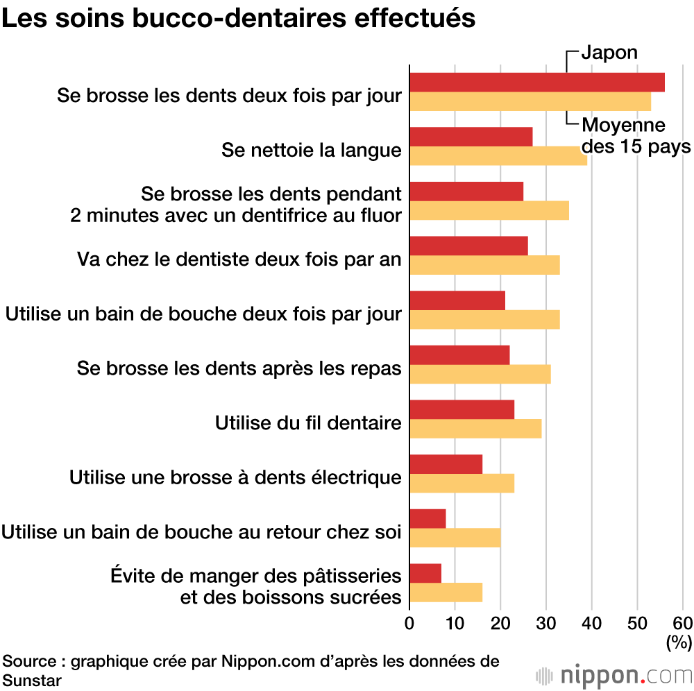 Pour ce qui est des soins bucco-dentaires pour la santé de la bouche et rafraîchir l’haleine, le Japon a été au-dessus de la moyenne pour une seule rubrique « Se brosse les dents deux fois par jour » avec 56 %. Les rubriques ayant eu un pourcentage élevé en moyenne pour les 15 pays, comme « Se nettoie la langue » 39 %, « Va chez le dentiste deux fois par an » 33 %, « Utilise un bain de bouche deux fois par jour » 33 %, sont restés dans la tranche des 20 % pour le Japon.