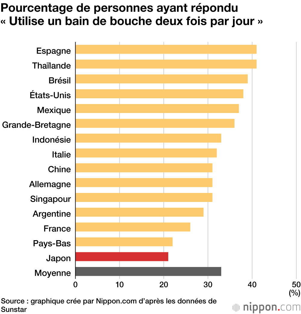 Le Japon est le pays où les gens sont les plus soucieux de leur haleine mais le pourcentage de personnes utilisant des bains de bouche 2 fois par jour sont en dernière position, avec 21 %. Avec 33 % pour la moyenne des 15 pays, les 41 % pour l’Espagne et la Thaïlande ont été presque le double du Japon. La France, avec 26 %, est en dessous de la moyenne.