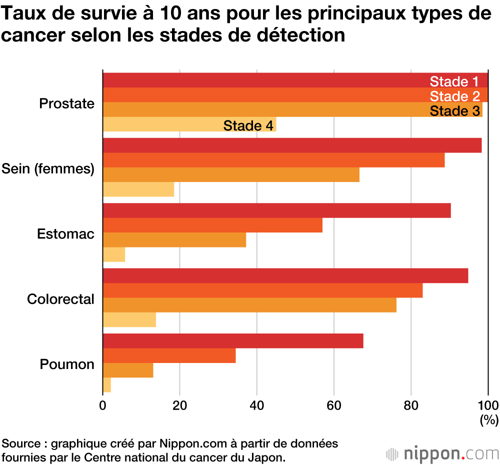 Le taux de survie à 10 ans selon le stade auquel le cancer a été détecté (le stade 1 étant le plus précoce des quatre stades du classement) montre clairement l’importance de la précocité de la détection et du traitement. Pour le cancer de l’estomac, le taux de survie à 10 ans, qui ne dépasse pas 5,8 % au stade 4, atteint 90,3 % en cas de détection au stade 1.