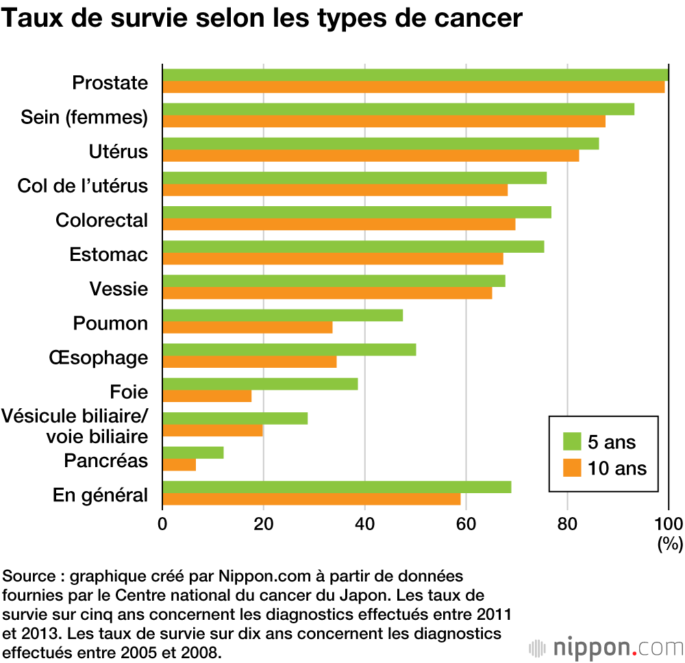 Le Centre national du cancer du Japon, en collaboration avec d’autres organismes, a annoncé que le taux de survie à 10 ans des patients diagnostiqués cancéreux entre 2005 et 2008 était de 58,9 %. Ce chiffre représente une augmentation de 0,6 % comparé au précédent rapport (diagnostics entre 2004 et 2007), montrant ainsi une hausse régulière depuis le début de cette étude périodique en 2016.
