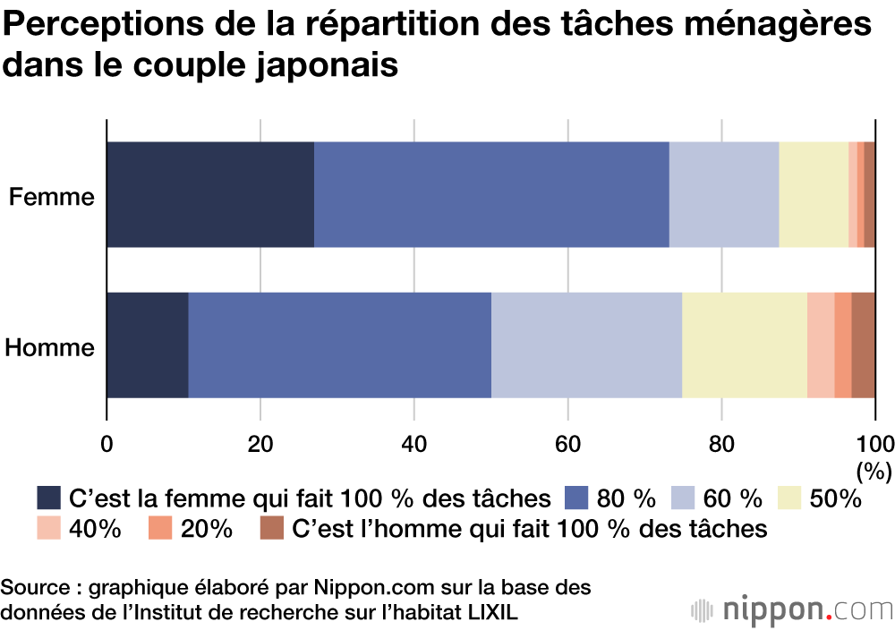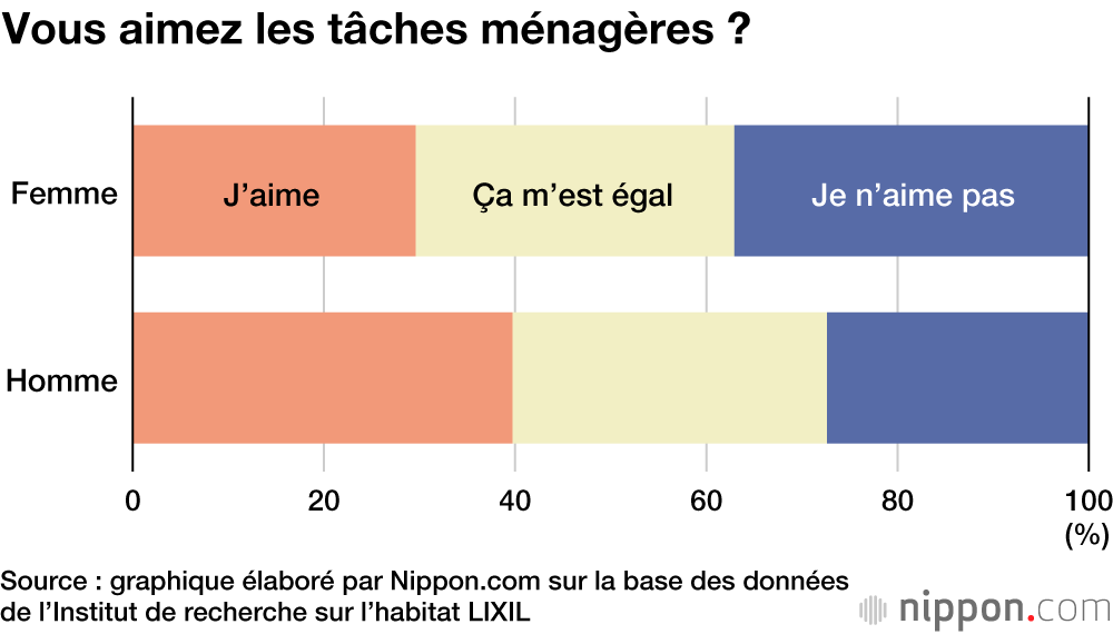 L’Institut de recherche sur l’habitat LIXIL a réalisé une étude dans tout le Japon parmi les hommes et les femmes entre 20 et 40 ans. À la question « Aimez-vous effectuer les tâches ménagères ? », 29,6 % des femmes ont répondu oui, par rapport à 39,7 % des hommes.