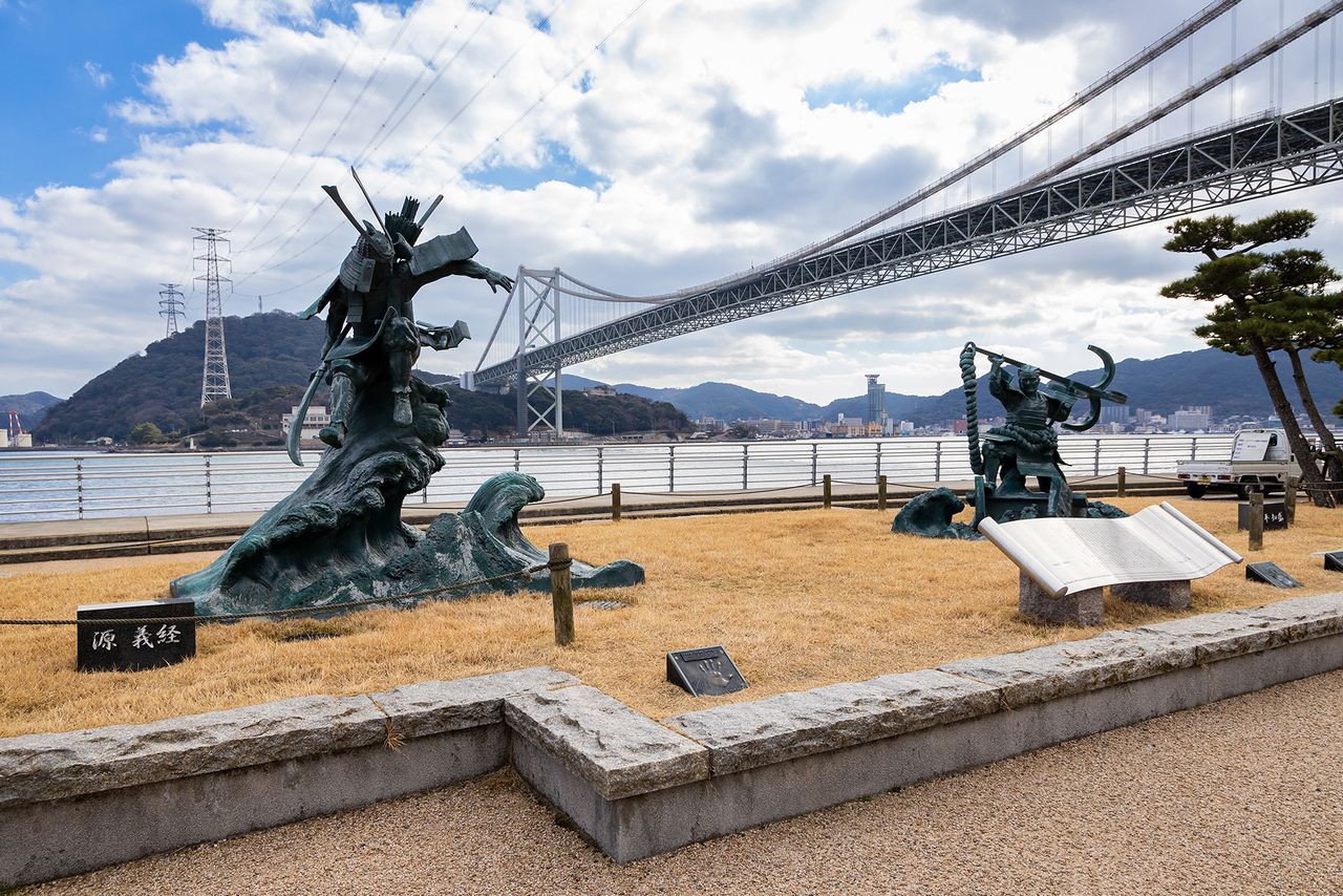 Statues de Minamoto no Yoshitsune et Taira no Tomomori sur le site de la bataille de Dan-no-ura. À l’arrière-plan, on distingue le pont Kanmon qui relie Honshû à Kyûshû. (Nippon.com)