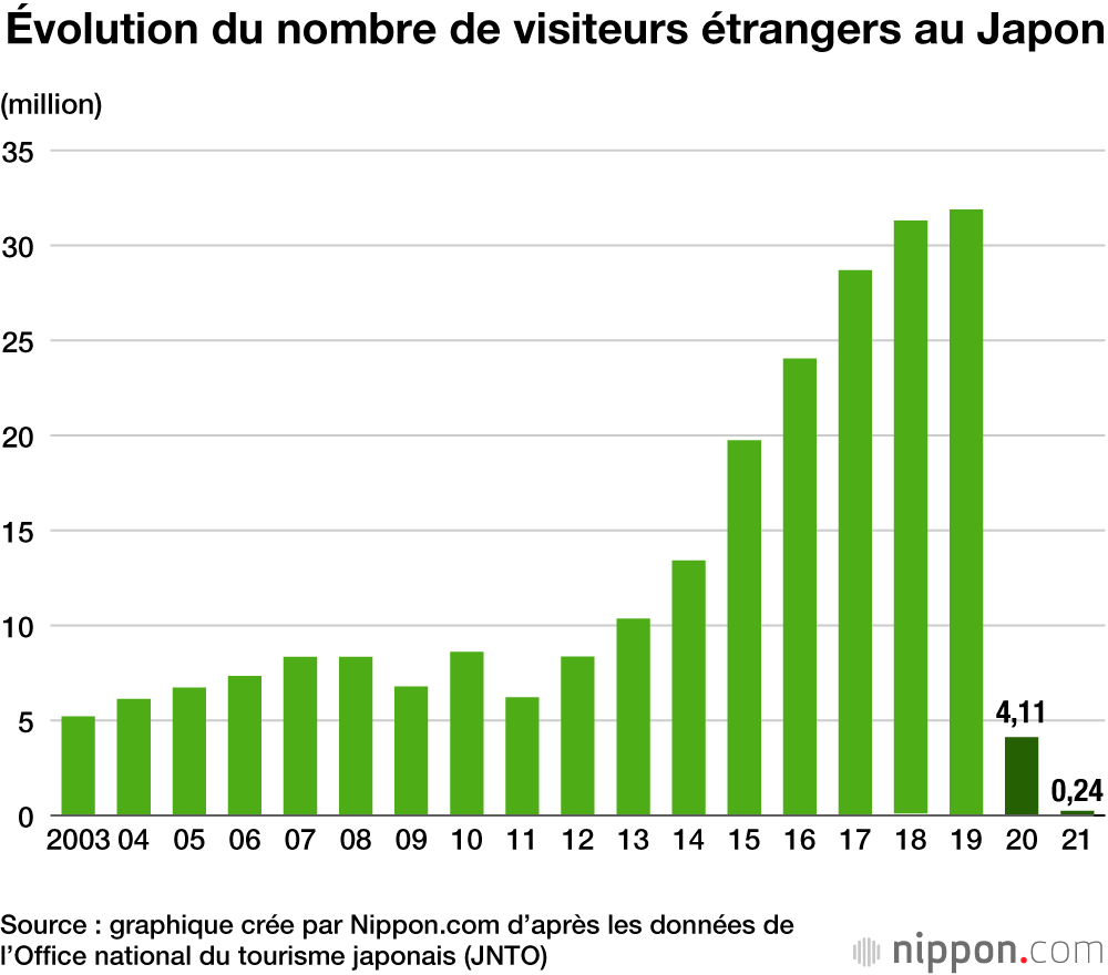 Selon l’Office national du tourisme japonais (JNTO), en 2021, le Japon n’a accueilli que 249 500 visiteurs étrangers (en majorité : voyage d’affaires, travailleurs et étudiants), le chiffre le plus bas depuis la collecte des premières statistiques en 1964, où le pays en avait alors accueilli 352 800.