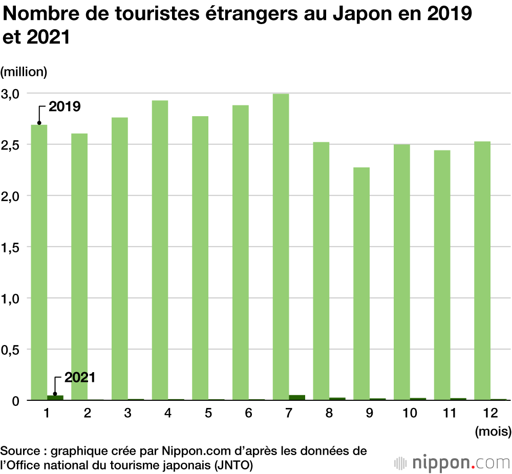 En 2021, les restrictions aux frontières se sont poursuivies, et restent toujours parmi les plus sévères au monde. Au mois de juillet, lors des Jeux, l’Archipel a accueilli plus de 50 000 personnes, notamment les athlètes, les médias et le personnel mobilisé pour la compétition. À l’automne, ils n’étaient plus que 20 000 par mois ) entrer sur le territoire nippon. Ce chiffre est un coup dur pour le pays ; il représente une diminution sans précédent de 99,2 % par rapport à 2019, avant la pandémie de coronavirus, et de 94,0 % par rapport à 2020.