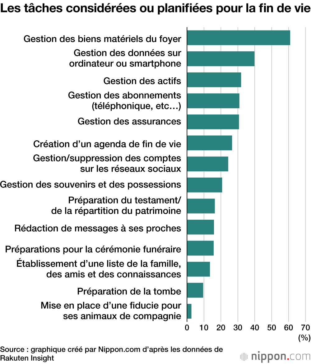 La société d’études de marché « Rakuten Insight » a conduit un sondage auprès de 1 000 adultes japonais âgés de 20 à 60 ans concernant leurs plans de fin de vie (shûkatsu). 4 % d’entre eux ont répondu qu’ils avaient déjà pris leurs dispositions, 7 % qu’ils allaient les prendre prochainement, et 58,6 % ont déclaré qu’ils feraient leurs préparatifs une fois le temps de leurs vieux jours venu. C’est donc près de 70 % qui ont l’intention d’établir un plan de fin de vie à un moment donné.