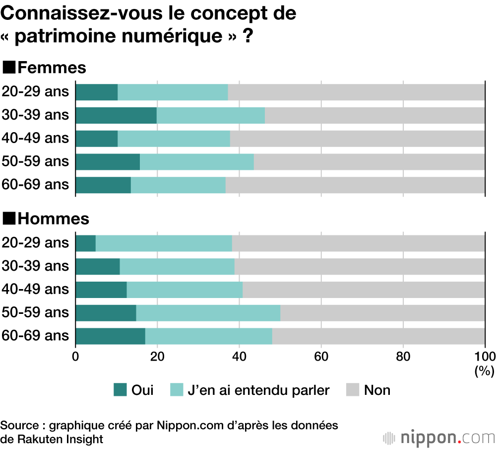 Par ailleurs, 41,8 % ont répondu qu’ils connaissaient bien ou avaient au moins déjà entendu parler du concept de « patrimoine numérique » (qui inclut les données sauvegardées sur les ordinateurs et les smartphones utilisés pendant la vie d’une personne, ses comptes sur les réseaux sociaux et les informations de connexion à ses banques en ligne, ainsi que les données internet de leurs navigateurs). La prise de conscience sur ce sujet semble être plus importante pour les hommes au fur et à mesure qu’ils vieillissent.