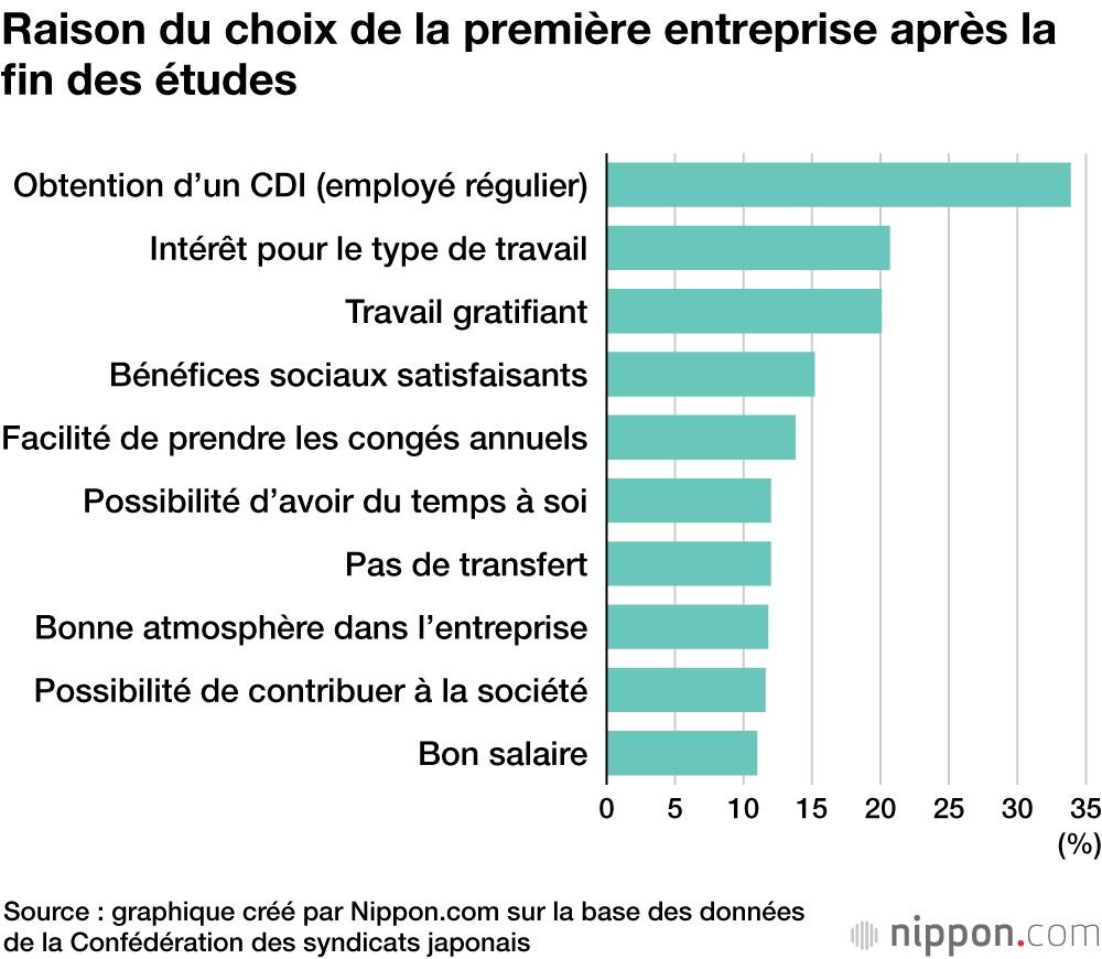 La principale raison du choix de la première entreprise après la fin des études (plusieurs réponses possibles) a été « L’obtention d’un CDI (employé régulier) », avec une majorité écrasante de 33,9 %, suivie par « L’intérêt pour le type de travail » avec 20,7 %, et « Le travail est gratifiant » avec 20,1 %.