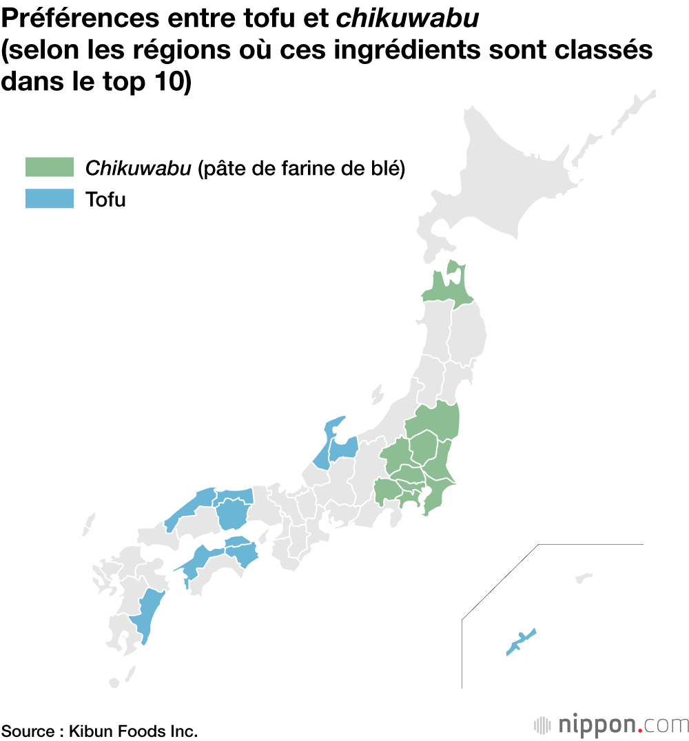 Pour les 48 variétés d’ingrédients de l’oden, le pourcentage de consommation par préfecture montre une différence bien marquée entre l’est et l’ouest du Japon. Si le pourcentage de consommation des produits de pâté de poisson comme chikuwa et satsuma-age est élevé dans tout le pays, le pâté de sardine tsumire est essentiellement populaire dans la région du Kantô et au sud du Tôhoku, alors que le kamaboko, demi-cylindre de pâté de poisson blanc, est très souvent utilisé dans le Kyûshû et la région de la mer intérieure de Seto.