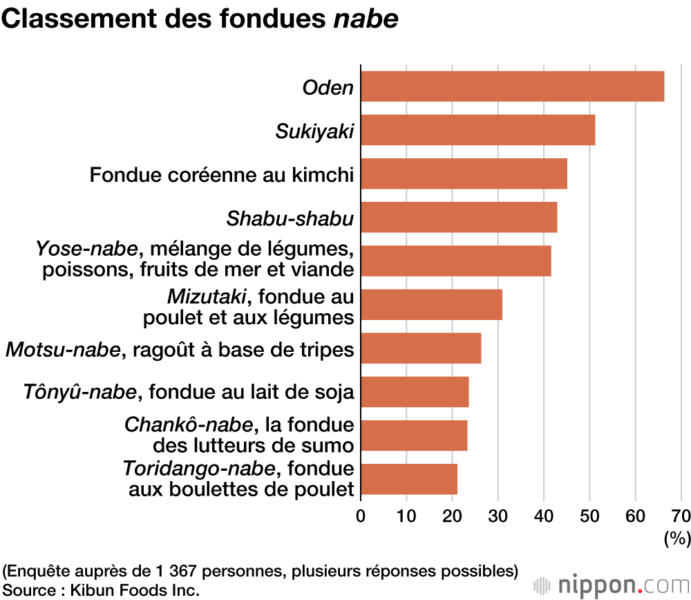 Les nabemono (ou tout simplement nabe qui signifie marmite en japonais), plats en marmite ou fondues, sont des mets d’hiver par excellence. Selon l’enquête sur les nabe consommées dans les familles en 2022, conduite par le siège social de Kibun Foods à Tokyo, le pot-au-feu oden se plaçait largement en tête pour la saison précédente avec 66,3 %, suivi par le sukiyaki, 51,2 % et la fondue coréenne au kimchi avec 45,1 %. L’oden reste à la première place pour la 24e année consécutive depuis l’enquête de 1999.