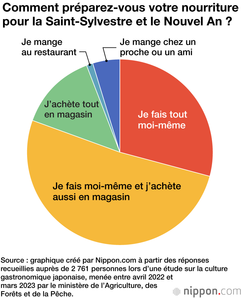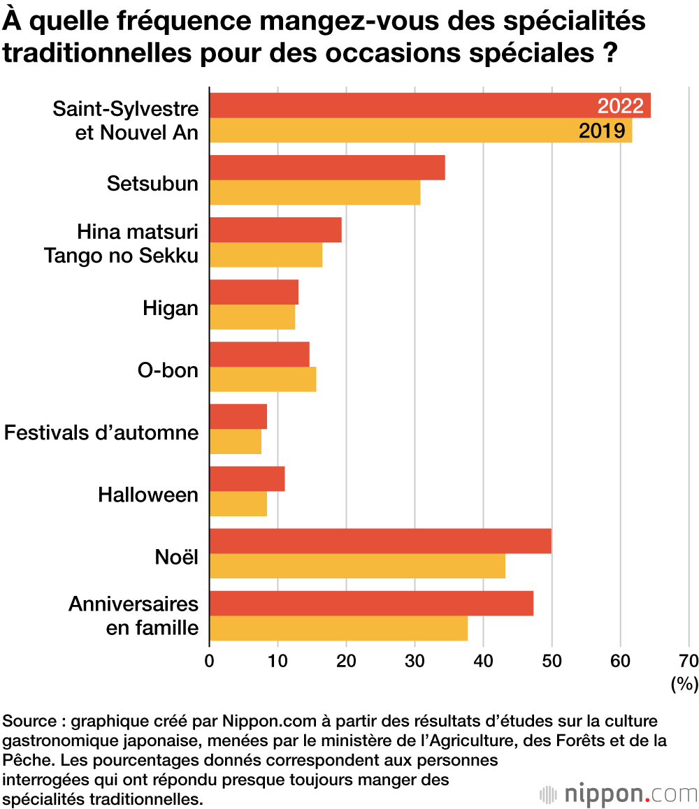 Selon les résultats de l’enquête, sur ceux qui ont déclaré « presque toujours » manger des repas traditionnels (64,4 %) pour les occasions spéciales, la période de l’année la plus fréquemment citée était Ômisoka (Saint-Sylvestre) et Shôgatsu (Nouvel An). Ils se régalent notamment de osechi ryôri, des incontournables toshikoshi soba (littéralement « soba de passage à la nouvelle année »), et de soupe zôni, un bouillon chaud servi avec des morceaux de riz mochi et des légumes. La deuxième occasion la plus fréquemment citée est le Setsubun, l’événement du début du mois de février qui marque la fin de l’hiver et le début du printemps. On trouve alors sur les tables des haricots de soja grillés fukumame, des rouleaux de sushi ehômaki ou encore des sardines marinées iwashini.