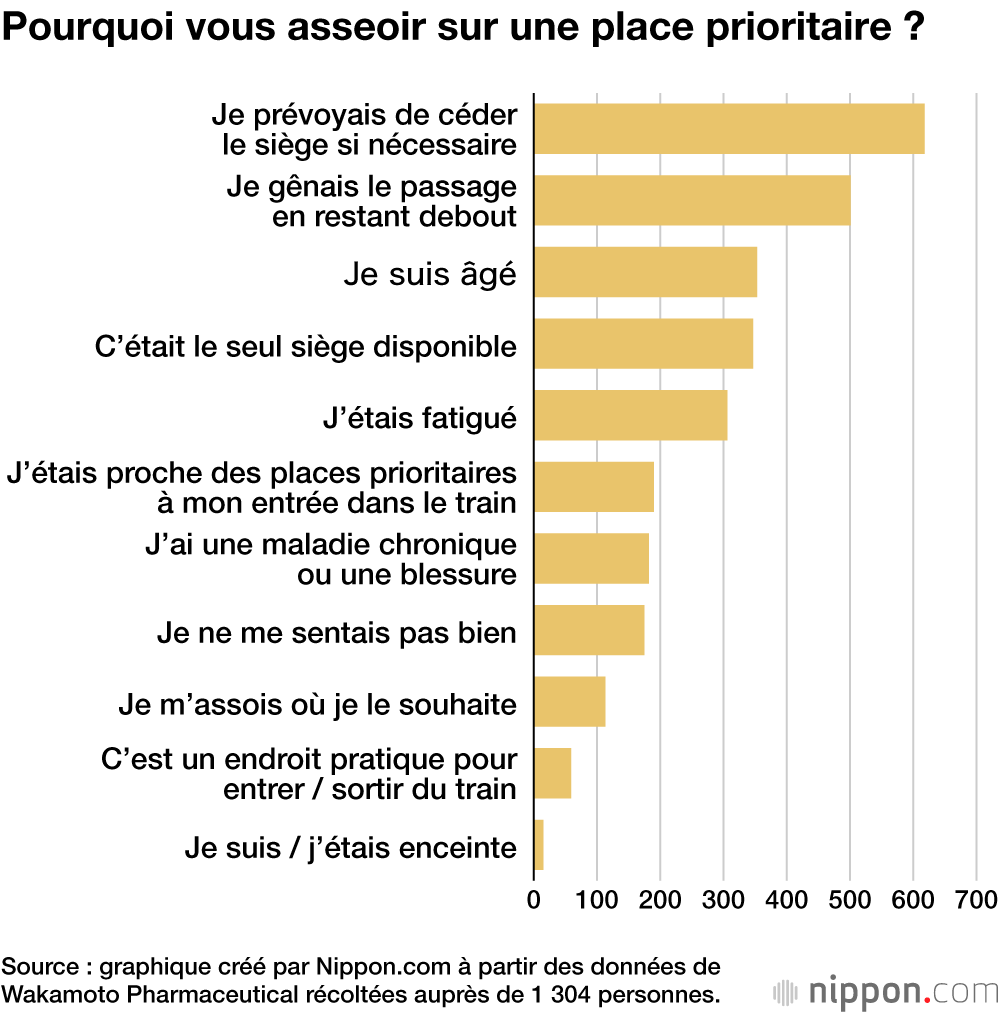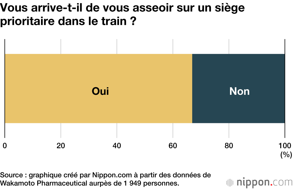 Un récent sondage conduit en ligne par Wakamoto Pharmaceutical auprès de 1 949 personnes révèle que 66,9 % d’entre eux ont parfois tendance à s’installer sur une place prioritaire dans un train.