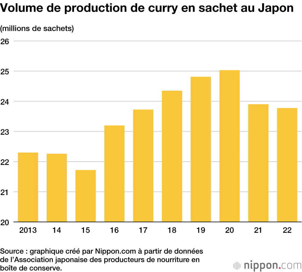 Ces dix dernières années, c’est en 2020 que le volume de production de curry a été le plus élevé, avec près de 25 millions de sachets. En plus du succès rencontré par les variétés régionales, et les « spice curry » (préparés de A à Z plutôt qu’à partir de roux de curry), le tendance à l’auto-confinement pendant la pandémie de coronavirus contraignant les Japonais à passer plus de temps chez eux a fait exploser le marché.