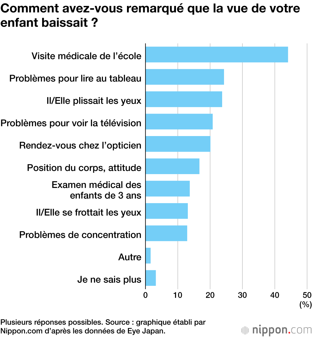 Le plus souvent les parents se rendent compte que la vue de leur enfant a baissé à l’occasion de la visite médicale organisée par l’école (44,1 %). Ils disent aussi avoir constaté qu’ils « commençaient à avoir du mal à lire au tableau » (24,3 %) et 23,7 % les voyaient « plisser les yeux plus souvent ».