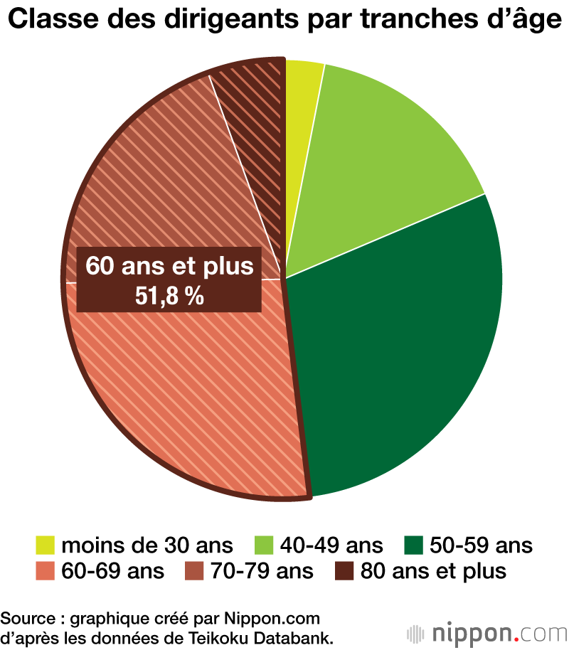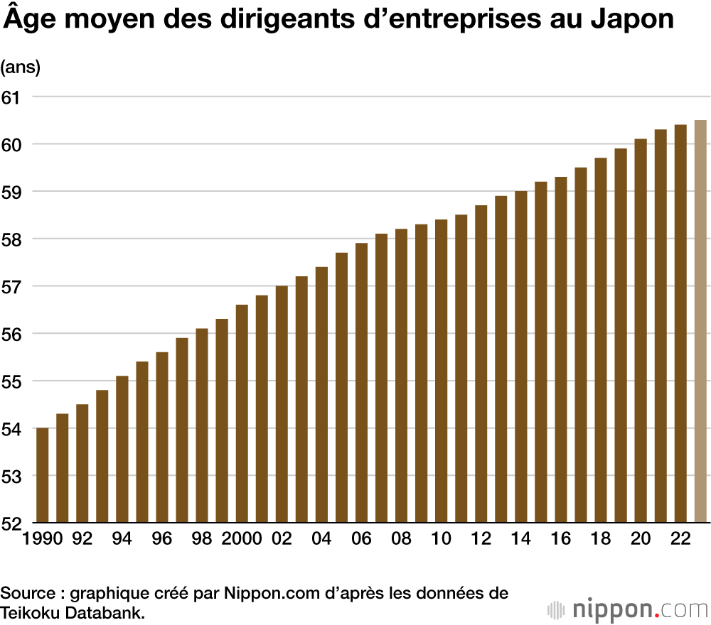 Selon les données de Teikoku Databank, en 2023, l’âge moyen des dirigeants d’entreprise est au Japon de 60,5 ans (0,1 an de plus qu’en 2022, un nouveau record est battu pour la 33e année consécutive). L’étude portait sur les dirigeants de 1,47 million d’entreprises sur l’ensemble du territoire, étaient exclus les associations à but non lucratif, les agences publiques ainsi que les auto-entrepreneurs.