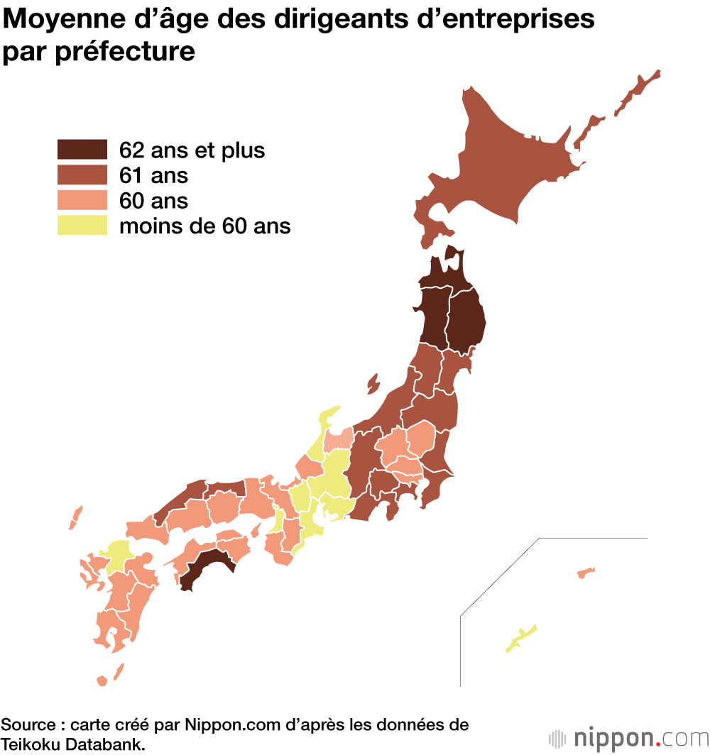 Par préfecture. Avec une moyenne de 62,5 ans (+0,1 par rapport à 2022), la préfecture d’Akita compte le plus grand nombre de dirigeants âgés. Viennent ensuite les préfectures d’Iwate (62,4 ans, +0,1) et de Kôchi (62,3 ans, +0,2). Les six préfectures de la région du nord-est dépassent la moyenne nationale des 60,5 ans. En revanche, la préfecture de Mie (59,4 ans, +0,3) enregistre l’âge moyen le plus bas pour la septième année consécutive depuis 2017. Dans l’ensemble, la tendance est « vieillissant à l’est, plus jeune à l’ouest ».