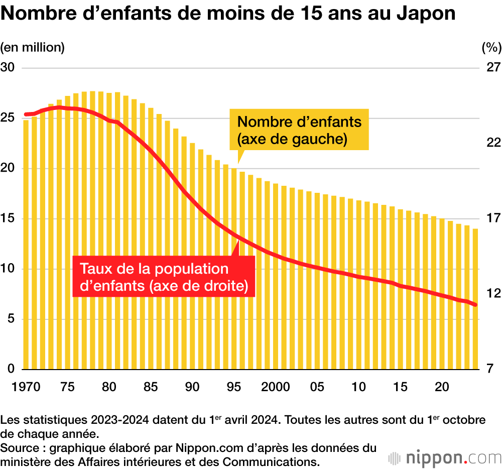 Selon les données du ministère des Affaires intérieures et des Communications publiées le 5 mai, le nombre d’enfants entre 0 et 14 ans au Japon est de 14,0 millions (à la date du 1er avril 2024). Ce résultat est inférieur de 330 000 à celui enregistré en 2023 et continue de diminuer depuis 1982, soit la 43e année consécutive.