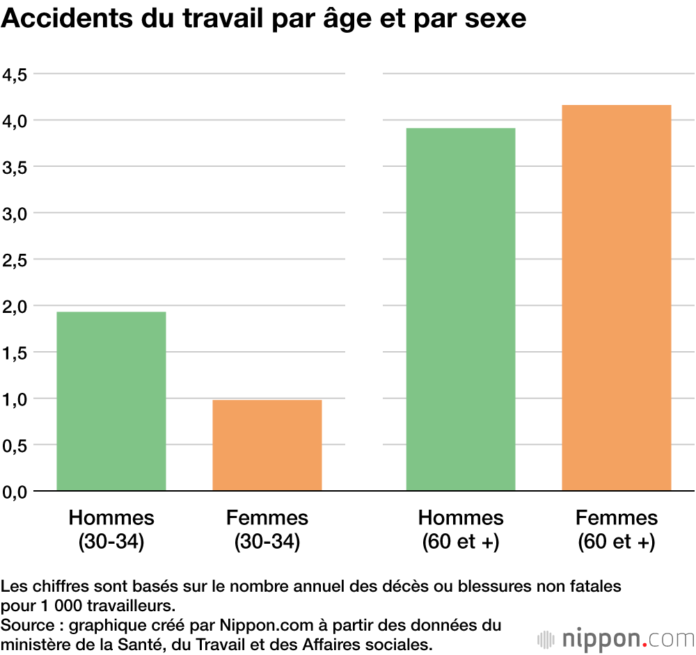 Selon le ministère de la Santé, du Travail et des Affaires sociales, les travailleurs âgés de 60 ans et plus représentent 18,7 % de la population active totale, soit une hausse de 9 points au cours des 20 dernières années. À 29,3 %, une augmentation de plus de 10 % a également été observée dans le ratio des travailleurs de cette tranche d’âge ayant été victime de blessures fatales et non fatales entraînant une absence de 4 jours ou plus.