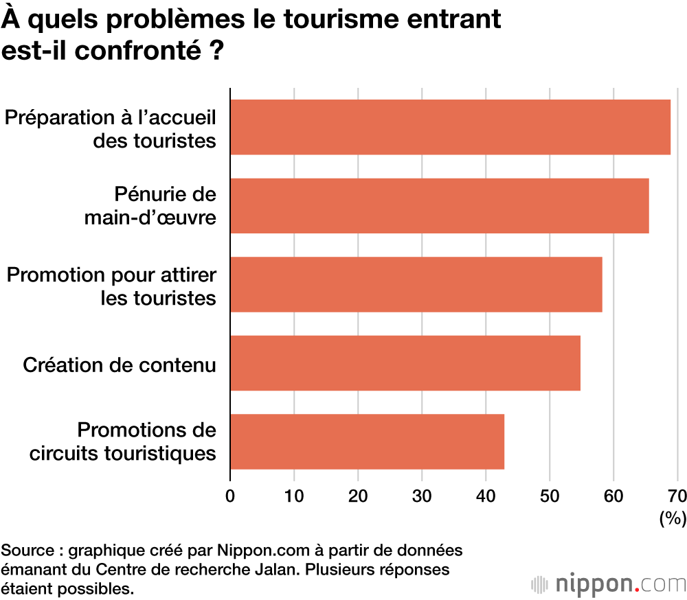La « préparation à l’accueil des touristes » est la réponse la plus fréquemment donnée par les personnes interrogées (68,9 %). Il s’agit notamment de problèmes tels que la mise à disposition de services en plusieurs langues et la prise de mesures pour réduire les zones engorgées. La deuxième réponse la plus fréquemment citée était la « pénurie de main-d’œuvre » (65,5 %) puis la « promotion pour attirer les touristes » (58,2 %).